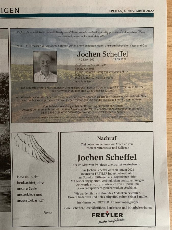 das Leben spielt leider nicht immer nach fairen Regeln. Wir wünschen Euch viel Kraft innerhalb der Familie, gute Freunde an Eurer Seite und viele der schönen Erinnerungen und Momente, welche Euch auf diesem Weg begleiten sollen. Im Herzen, in der Liebe bleibt Jochen mit Euch verbunden.
